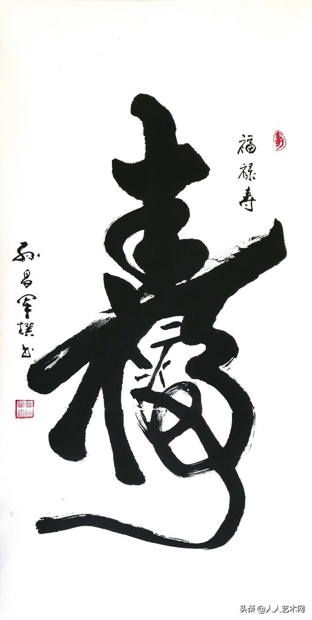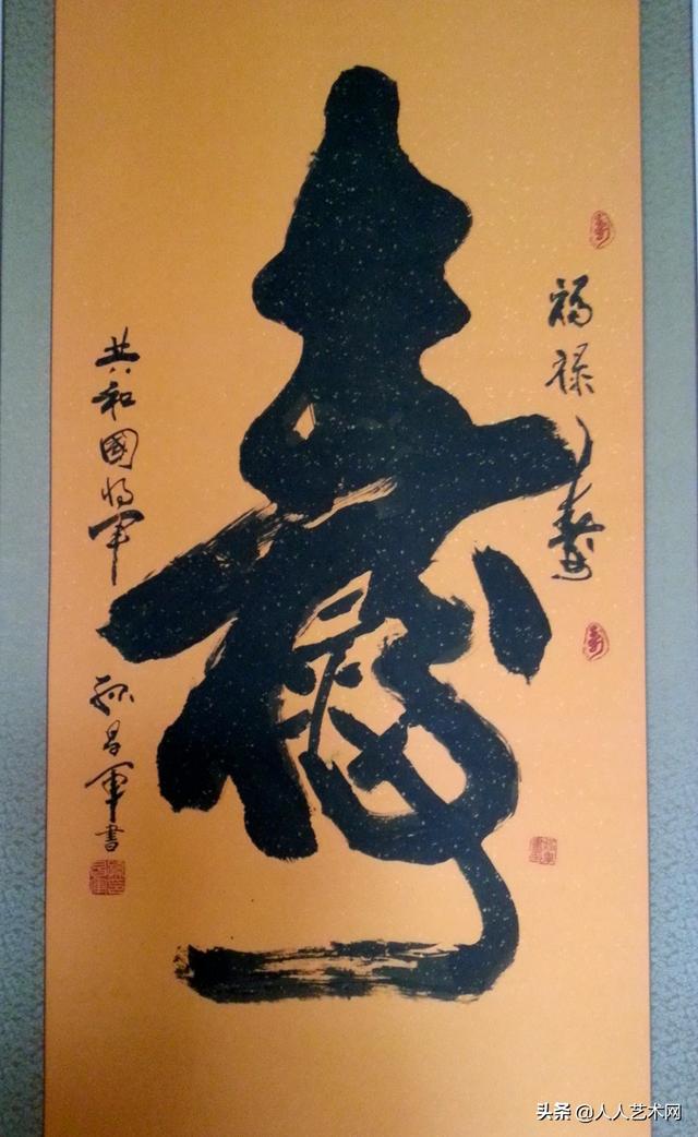 寿,自古以来就是人们憧憬和向往的字眼,它象征着长寿吉祥,长命百岁,幸福安康,是一个无比美好和叫人崇敬的字眼。孙将军在一个“寿”字中,包含着“寿比南山不老松”几个字,让人眼前立马就能闪现出鹤舞松间的吉祥画面。所有祝福,都在字中了。他的这个“寿”字之所以广受欢迎,也验证了晚辈们的一片孝心,试想:将大红的寿字一裱,挂于堂中,父母在前,儿孙在后,一家人其乐融融,欢天喜地地为老人贺寿祝福,这场面多温馨动人啊,人世间的所谓幸福圆满,莫过于此了!