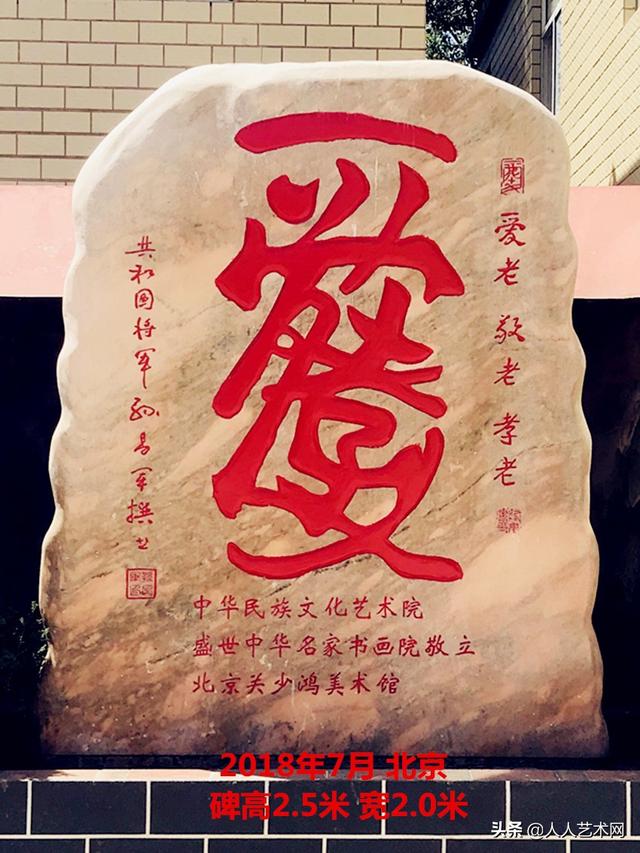 有了棱角分明的“爱”字,孙将军还发明了温馨亲切的“爱”字,里面包含着“一心孝老,一心爱老”几个字。说起来,中华民族孝老、爱老的传统源远流长,甚至形成了专门的理论,元代编录的《二十四孝》,便是由历代24个孝子从不同角度、不同环境、不同遭遇行孝的故事汇集而成,千年来被人们奉为行孝尽善的经典。受孔孟思想熏陶的齐鲁儿女,更是讲究孝道,古有“父母在不远游”之说,提倡的就是做儿女的要在父母膝前尽孝。但现在,是一个讲究理想抱负的时代,“海阔凭鱼跃,天高任鸟飞”,好儿女志在四方,长大了,就像羽翼丰满的鸟儿一样飞走了,外面的世界天高海阔,任我飞翔,想在小家之中固守着父母似乎不太可能。所以,孙将军的这个将“孝”藏于“爱”之中的创造,是他对“爱”与“孝”密不可分的理解,也是他对年轻人殷殷的嘱托和叮咛,提醒他们不管走到哪里,都要怀揣着对家国的大爱,同时不要忘了自己是做儿女的,根在何处,是谁给予了自己生命,自己该如何报答生我养我的母亲,历尽沧桑的祖国?