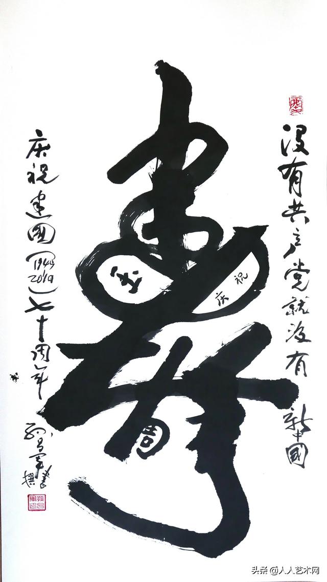 为迎接建党90周年,孙将军还精心创作了与众不同的“寿”字作品,作为一个老党员的贺礼。他的“寿”字,如同康熙在1679年所书的“福”字(此字现存于北京恭王府),它巧妙地容纳了“多”、“子”、“才”、“寿”、“田”字,寓意为“多子”、“多福”、“多寿”、“多才”、“多田”、“福寿双全”、“长寿”等,成为唯一不能倒挂的“福”字。孙将军创作的“寿”字,同样巧妙地容“建”、“党”、“九”、“十”、“周”、“年”6个汉字,从字形上看像是“寿”字,而且是“长寿”,又加上“没有共产党就没有新中国”的上款,彰显了一种坚定的信念。整幅作品苍劲有力,内涵丰富,既有创新意义又雅致美观。