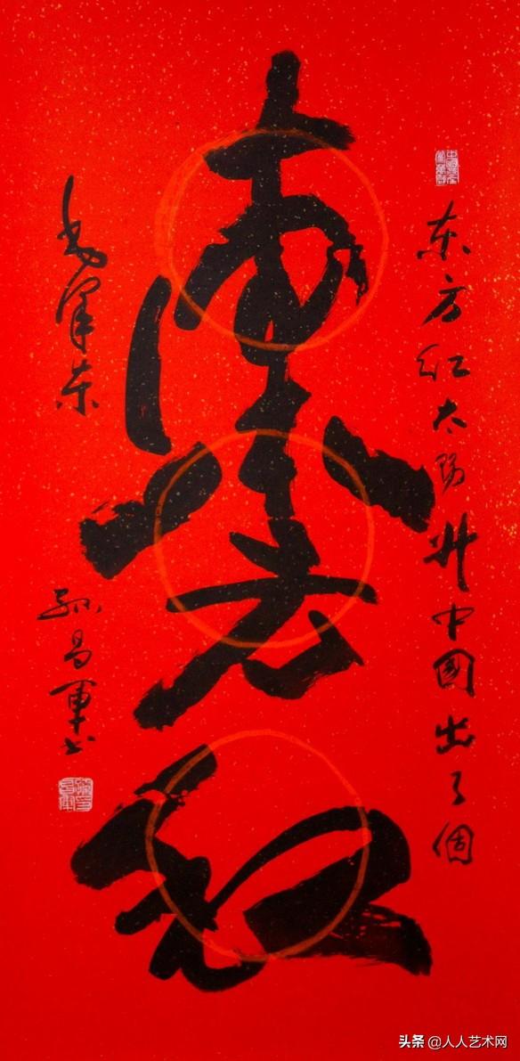 孙昌军将军的组字书法“东方红”,龙飞凤舞,大气磅礴,看到它,那首耳熟能详、响彻了一个时代的民歌便仿佛在耳边响起:“东方红,太阳升,中国出了个毛泽东……”。在这幅组字书法中,“毛泽东”的名字蕴藏其中,既合理又恰切,令人自然而然地想到,太阳与一代伟人不可分割的关系。