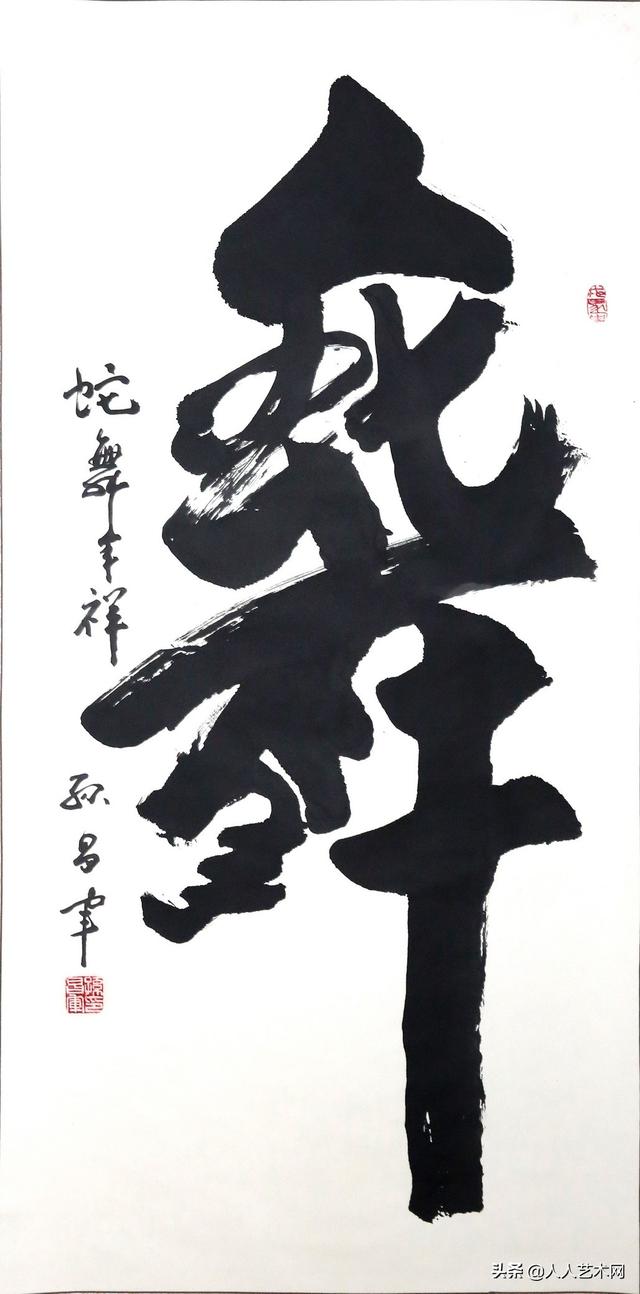 孙昌军将军的组字书法,却摆脱了以往组字书法的局限和弱点。他的组字符合书法的定义。他使用的工具是毛笔,使用的材料是宣纸和墨汁,载体是汉字,结体、行笔、落款、用印完整,他把不同的五大字体楷、篆、行、草、隶等融为一体,形成了独特的组字书法艺术。不是凭空臆造的组合,而是根植于中华民族传统文化和历史文化,有理有据,有根有源,有情有义。他组的字,寓意深远,内涵丰富,像宝石一样,折射出多姿多彩的棱角和光芒,无论从哪个角度解读,都自有寓意,让人一再品读,忍不住频频颔首,或者会心一笑。一句话,这位老将军的组字书法,有嚼头!如果你去过南方,品味过那里的橄榄,就会相信,这位老人家的组字,就像橄榄一样耐人寻味,回味悠长。