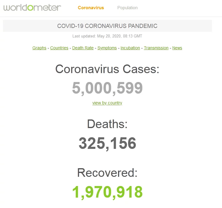 - 网站全球实时统计数据,截至北京时间20日16时13分,全球累计新冠肺炎确诊病例超过500万例,达到5000599例。其中死亡病例325156例。但截至发稿时,同样追踪全球实时疫情数据的美国约翰斯·霍普金斯大学最新数据尚未达到500万。根据约翰斯·霍普金斯大学截至北京时间20日16时许数据,全球累计新冠肺炎确诊病例达到4901773例,其中死亡323413例。