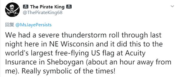在美国多地因警察暴力执法致使非洲裔男子乔治·弗洛伊德死亡一事爆发大规模抗议活动之际,位于美国境内的世界上最大的一面自由悬挂的美国国旗也遭“飞来横祸”被损坏。 据美媒报道,当地时间6月2日晚,美国威斯康星州希博伊根地区遭到暴风雨袭击,飘扬在希博伊根县锐意保险公司( Acuity Insurance)总部高达400英尺(约122米)旗杆上的最大的一面自由悬挂的美国国旗被强风撕毁,且已经无法修复。