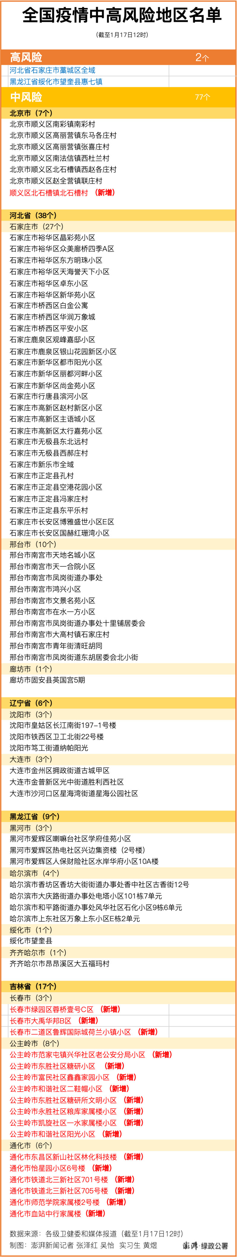 全国疫情中高风险地区名单,数据来源:各级卫健委和媒体报道(截至1月17日12时)。制图:澎湃新闻记者 张泽红 吴怡 实习生 黄煜