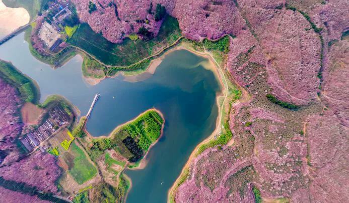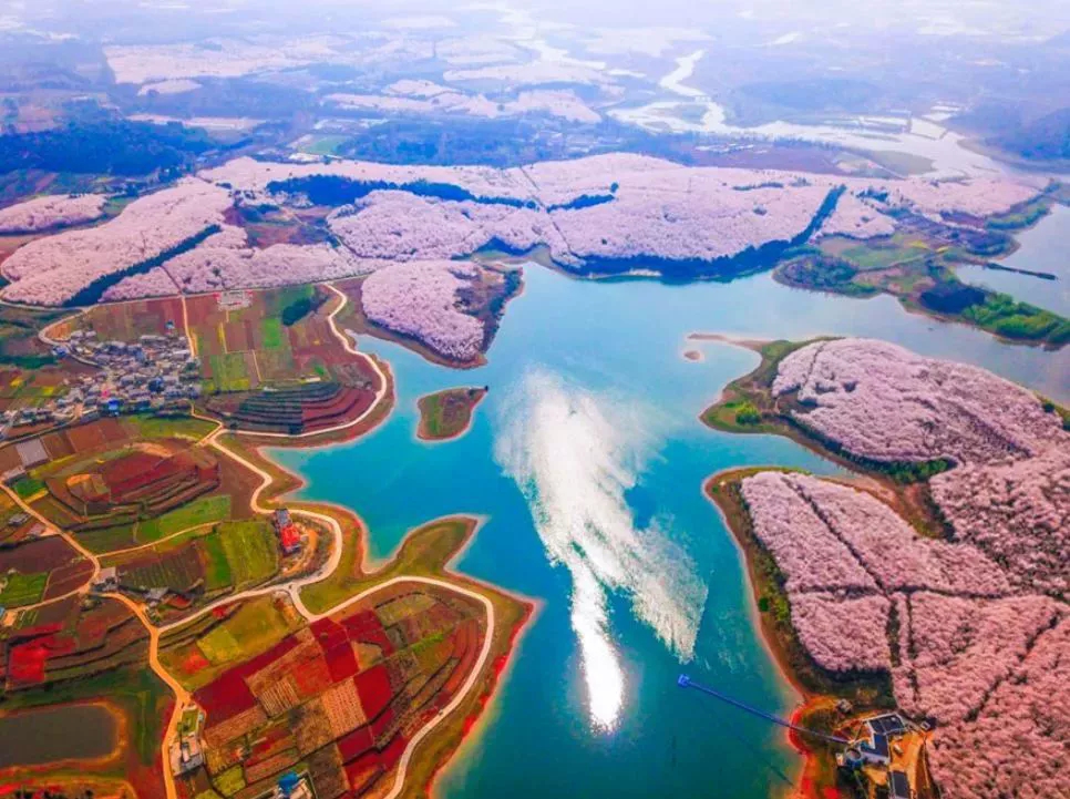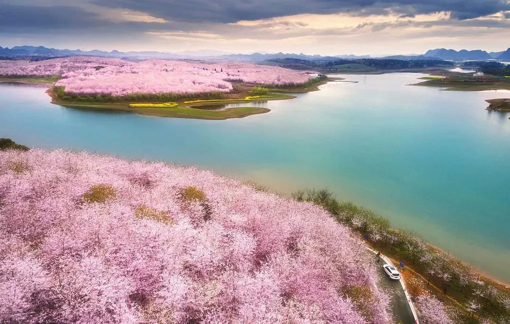 在平坝农场,上万亩的樱花被红枫湖分割成了许多个独立小岛,你可以骑行,也可以徒步,但不管选用哪种方式,沿途都是浪漫的风景。