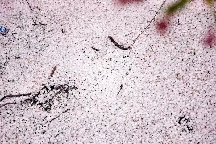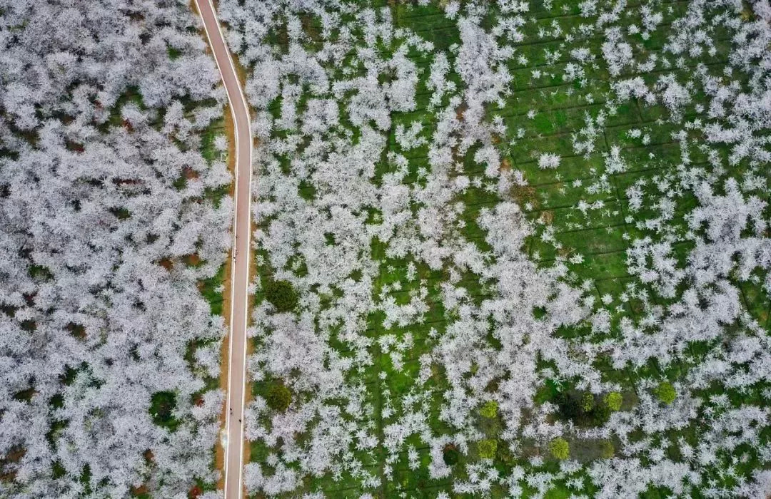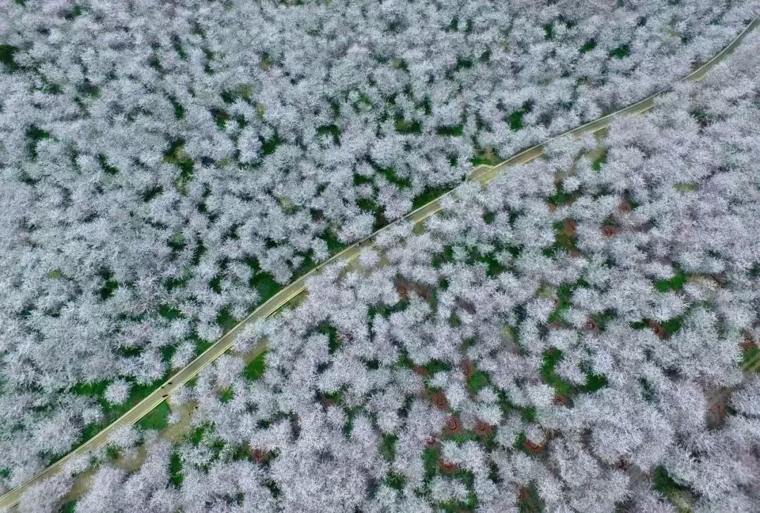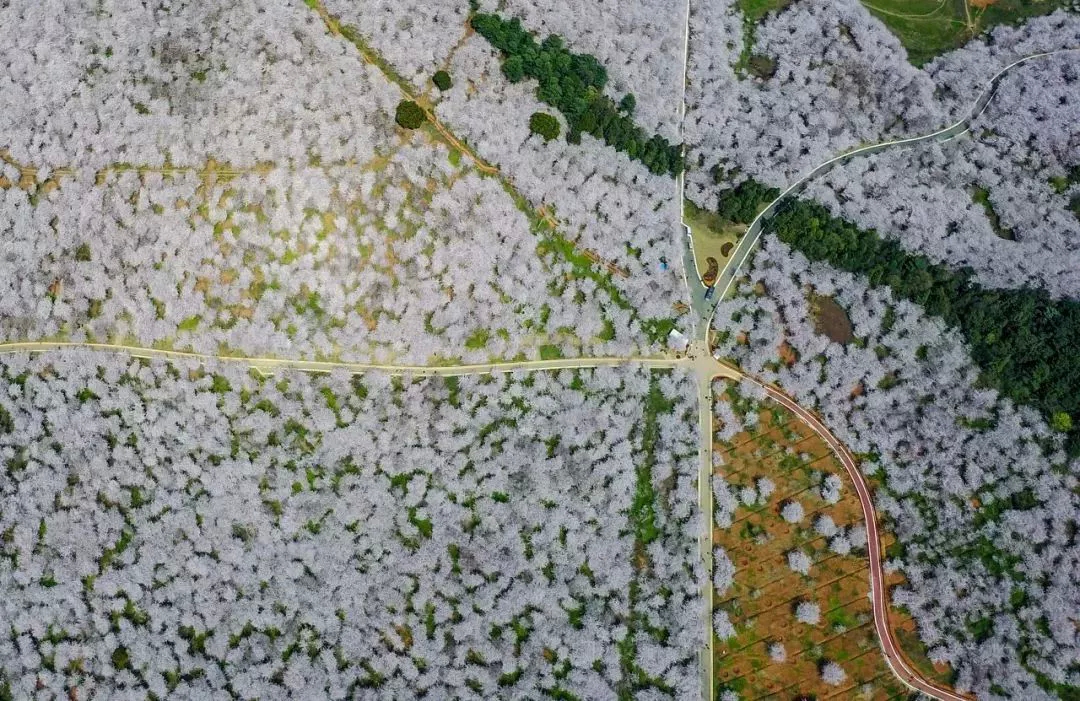 从高空俯瞰,盛开的早樱花犹如镶嵌在绿毯上的绣花,抱团打簇,好不热闹!
