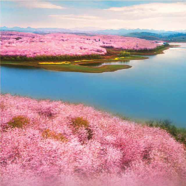 盛花期,上万亩樱花紧连着红枫湖畔蔓延,将大地点缀成一片浪漫粉色,只见满眼黛色的山、碧蓝色的湖面、翠绿的草树和朦胧的粉红的花。