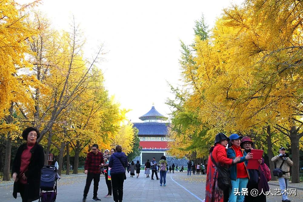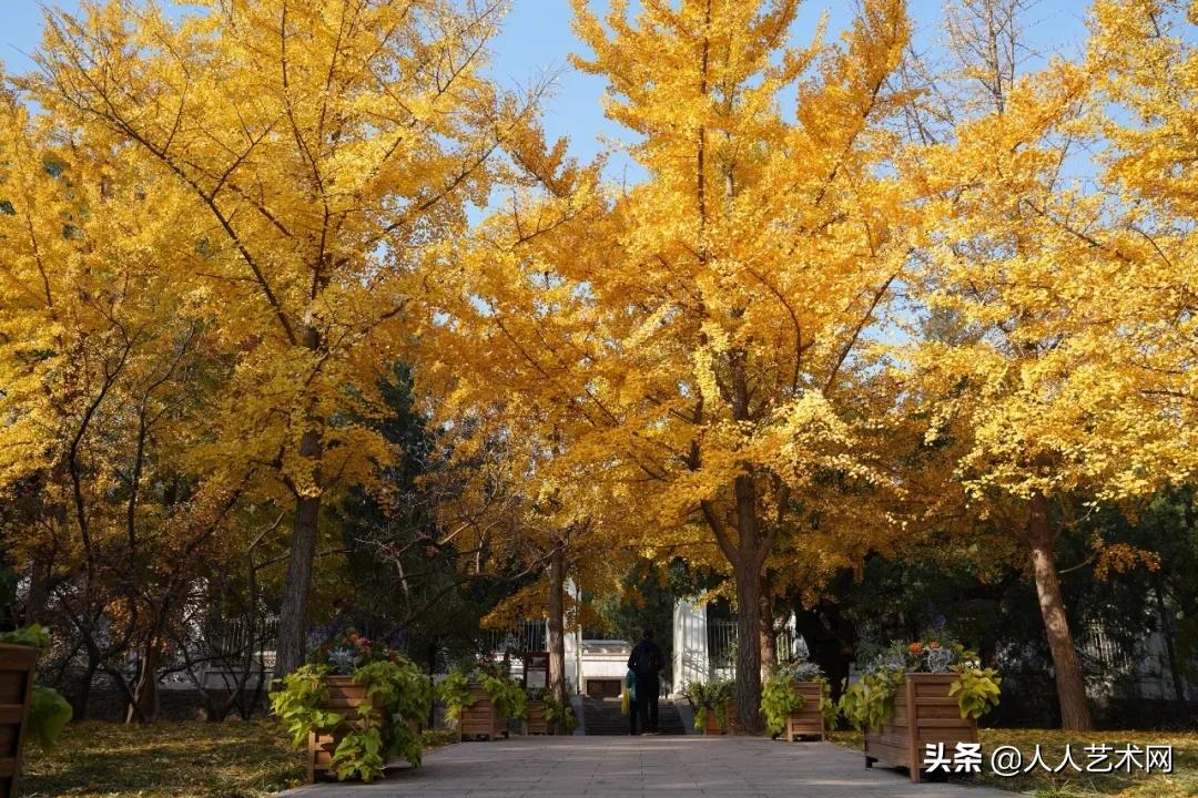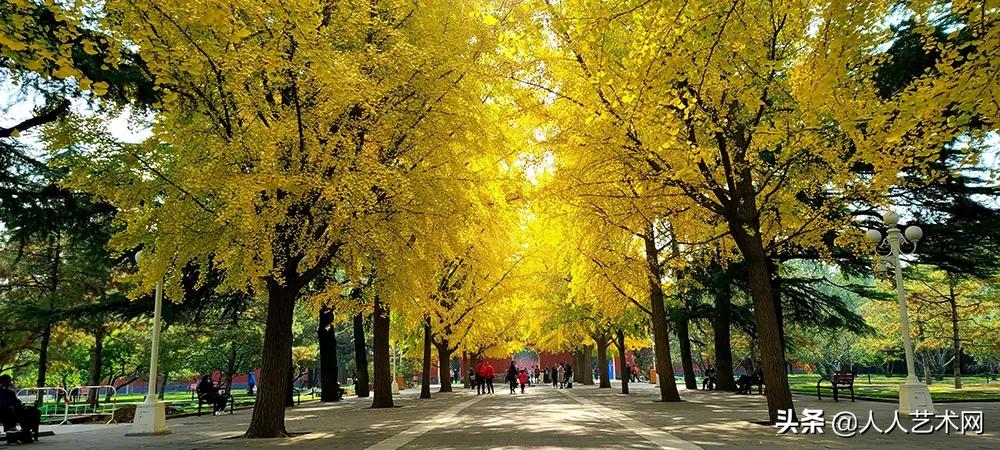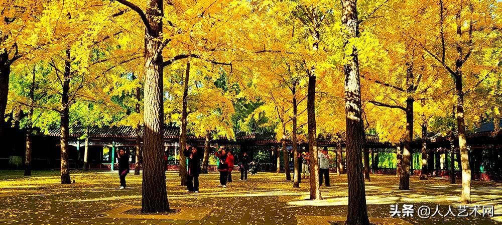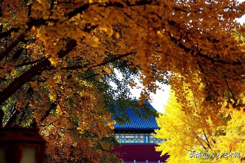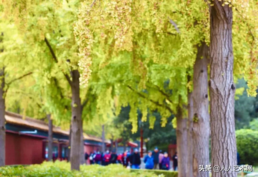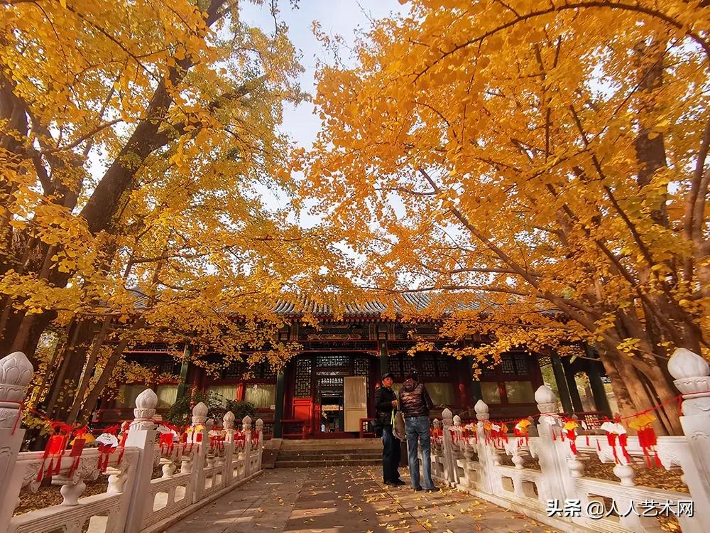 几十株金黄色的银杏树在彩绘长廊、红墙金瓦的映衬下格外绚丽。