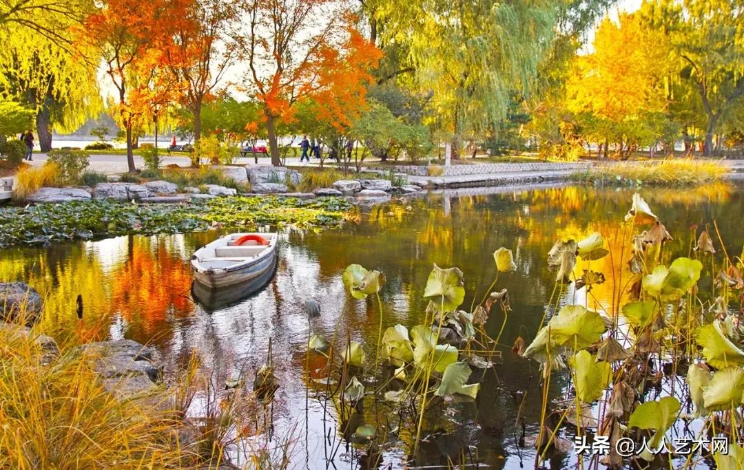 玉渊潭公园樱花园,小湖畔大片芦苇与水中秋叶的倒影相得益彰,还有睡莲、菖蒲、荇菜等品种丰富的水生植物,可谓“树树皆秋色,山山唯落辉”。