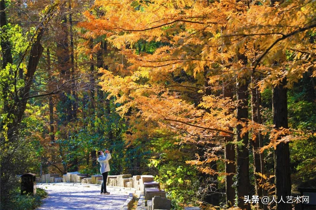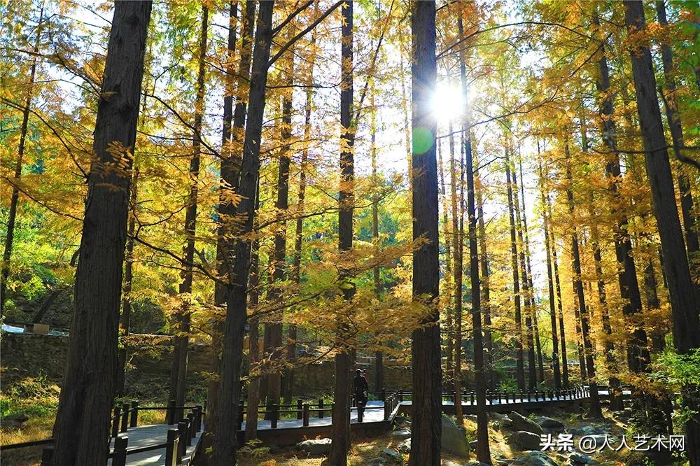 北京植物园樱桃沟内北方最大的水杉林进入秋叶观赏期。原本绿色的树叶渐渐转变为耀眼的金色,阳光洒下绚丽夺目,尽显秋韵。