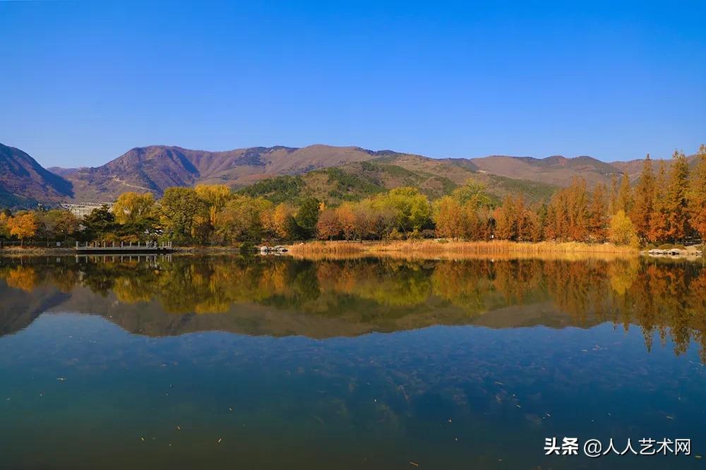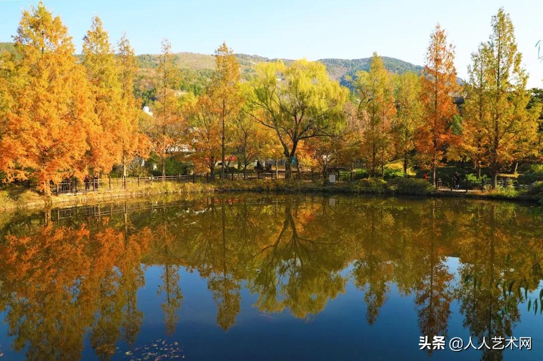 此外,在园区中湖及北湖周边也可以欣赏到美丽的水杉,在这里远山近景倒映在平静无波的水面之上,犹如一幅优美的深秋画卷。