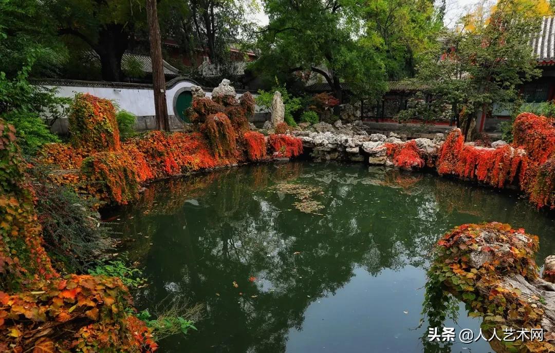 中国园林博物馆的半亩轩榭、双环亭等处,五叶地锦与黄栌、白蜡和元宝枫等彩叶树种相映成趣,尽显金秋风采。
