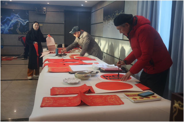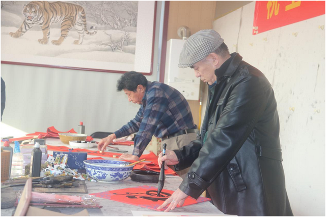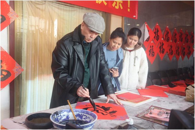 “新春送福”活动中,来自北京的书法家们在大石各庄村百年梨园,现场为村民写春联、送“福”字。书法家们挥毫泼墨,妙笔奉春联、浓墨寄祝福,字体各异的书法跃然特制的红纸上。“福星高照文明院,春意长留和睦家”“龙舞丰年辞旧岁,蛇迎盛世贺新春”,一副副饱含祝福的春联、一个个寓意吉祥的“福”字,传递着北京书法家对燕郊镇人民的新年祝福。