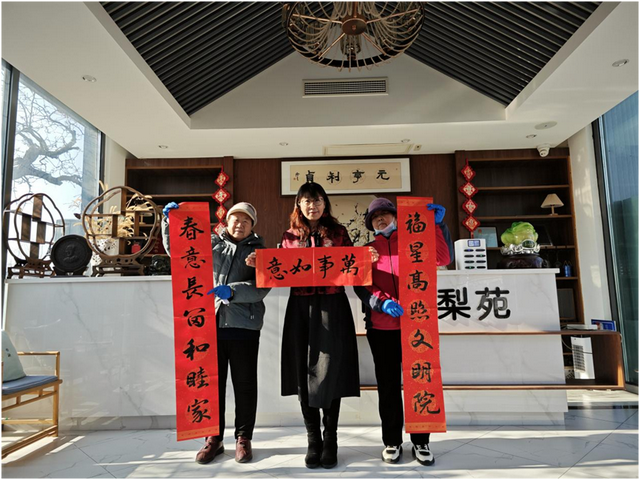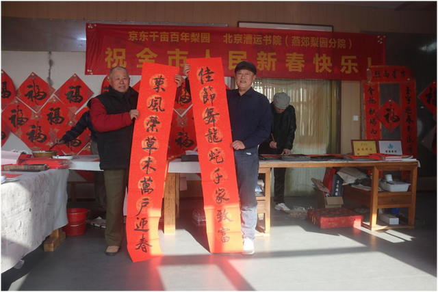 北京市通州区人大常委会原办公室主任、通州区老年书画协会会长刘学力特意为大石各庄村退役军人、共产党员、梨树种植能手张德生送上春联“佳节舞龙蛇千家致富,东风荣草木万户迎春”。张德生表示:“手写的春联和‘福’字更显吉祥,北京书法家们深情的祝福、浓浓的情意跃然字里行间、温暖在我们心中。”