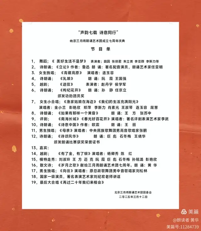 【主持词】 尊敬的各位艺术家、各位老师、各位来宾、各位团员,大家下午好: 时光荏苒,初心如磐。在这春意盎然的三月,我们满怀喜悦与感动,共同见证三月雨朗诵艺术团建团七周年庆典活动。回首七年征程,在徐文杰团长的带领下,我们以声音为舟,以文字为帆,在朗诵艺术的海洋中乘风破浪、探索、追寻。从初创时的青涩到如今的逐渐成熟,从社区舞台走向更广阔的天地,每一段诵读的篇章、每一束舞台的灯光,都凝聚着我们所有团员对语言艺术的热爱与坚守。七年来,我们创作了多部原创作品,举办了几百场的公益演出,参加朗诵大赛多人次获奖,用声音传递温暖,用诗意连接心灵。今天,我们以诗相会,以声传情。舞台上的每一句朗诵,不仅是艺术的表达,更是对团队精神与人文情怀的礼赞。七周年的里程碑不是终点,而是崭新的起点。未来,我们将继续秉承“以声载道,以文化人”的宗旨,深耕朗诵艺术,创新表现形式,继承中华优秀传统文化,让更多人在文字与声音的交融中,感受民族文化的生命力。愿三月雨朗诵艺术团如春雨润物,滋养更多心灵;愿我们的声音永远清澈,传递时代的正能量......在此特别感恩艺术家和老师们的关怀和指导,感谢全体团员齐心协力在舞台上的如花绽放。