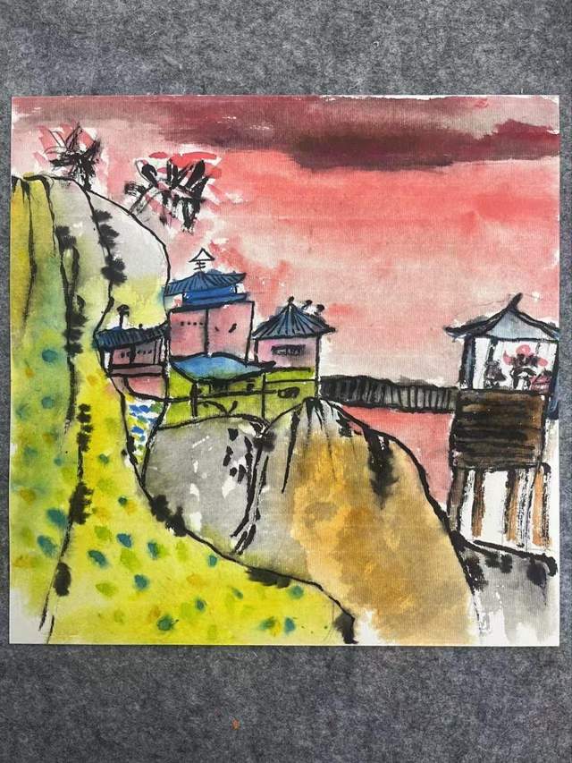 四、儿童艺术教育的现状、挑战与反思 当前儿童艺术教育呈现出多元化的面貌,但也面临着诸多挑战。从“元画未来”栏目中可以看到,有学校组织的集体创作(如青岛凭海临风小学的多幅作品),也有各类平台提供的展示机会,这反映了社会对儿童美育的日益重视。 然而,深入分析现状,我们仍发现一些值得关注的问题。 - 1.技巧训练与创造力保护的平衡难题。部分作品显示出明显的技法训练痕迹,如画建筑的,对建筑结构的精细刻画;画山石的,对质感的表现等。适度的技法传授是必要的,但过度强调则可能压制儿童的原创力。理想的艺术教育应该如《戏蝶图》(陈帅宇,10岁,青岛)般守护游戏精神,让儿童在自由表达中发现美的规律。教师应作为引导者而非指令者,鼓励儿童像《千色之秋》(程美琪,10岁,青岛)那样自由探索色彩的可能性,而非机械地复制成人设定的标准。