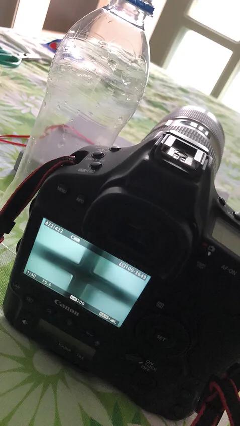 支好三脚架,照相机调整到位,对准主体调整好速度光圈和快门,聚焦清晰,固定。这些最基本的要素,最好全用手动。在拍摄前,将塑料瓶放在镜头前,上下左右移动,观察取景器里的镜像,合理构图,定格到最佳,然后释放快门,完成拍摄。